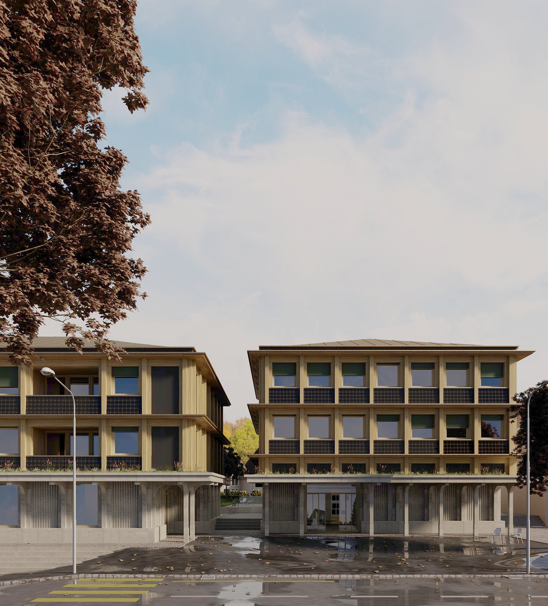 Der Ausdruck wird durch eine klassische Dreiteilung organisiert, welche dem repräsentativen Charakter des Baus Rechnung trägt und das Gebäude in ein Sockelgeschoss aus Beton, zwei Regelgeschosse aus Holz sowie das Walmdach aus Metall unterteilt. Durch die klare Tektonik verschmelzen die drei Bereiche zu einem stimmigen Gesamtbild. Holz dominiert den Ausdruck des Neubaus klar und wird so dem Zeitgeist der Nachhaltigkeit gerecht. Die primäre Struktur aus Holz wird durch dunkle Ausfachungen akzentuiert und hervorgehoben. Diese Ausfachungen bestehen an den strategisch sinnvollen Bereichen aus Photovoltaikmodulen und in den eher schattigen Zonen aus schwarz gefärbten Holzpanelen. So wird trotz den wechselnden Materialien eine einheitliche und stimmige Optik erzielt.