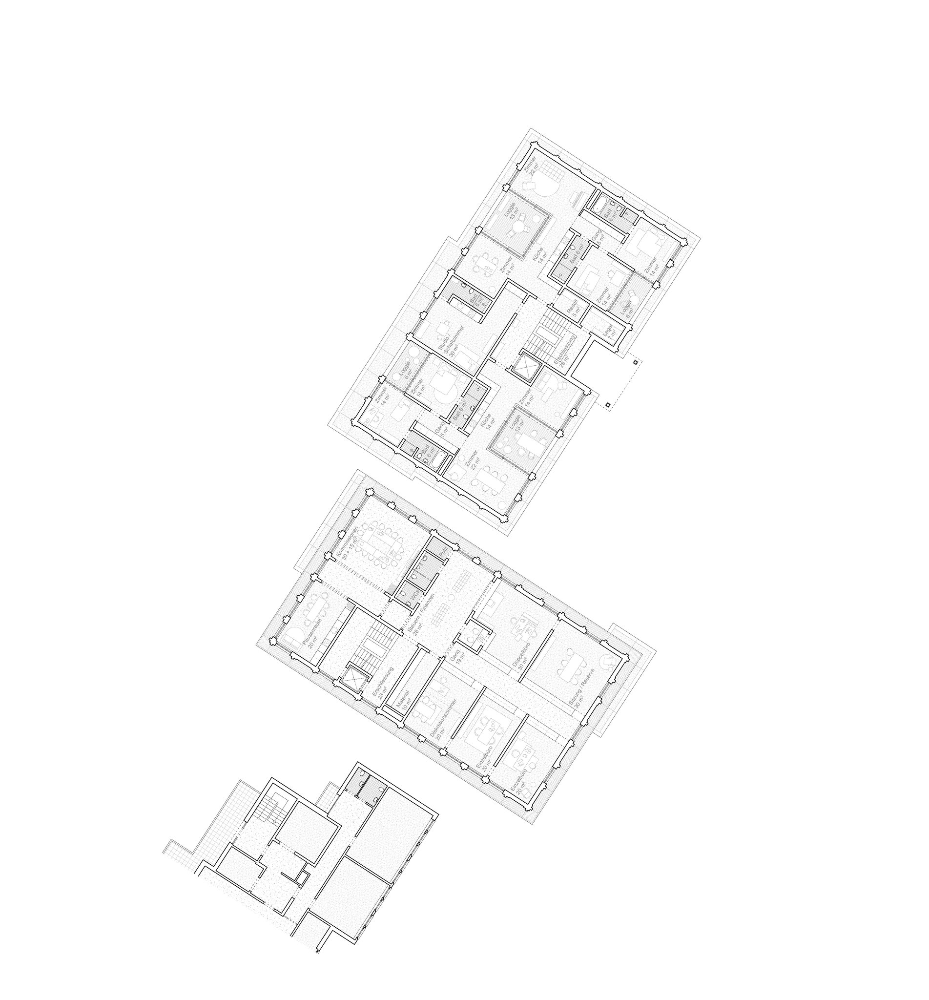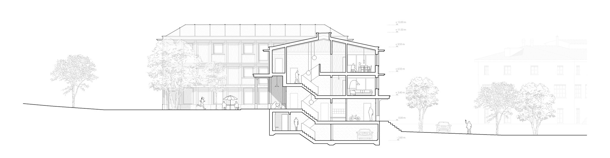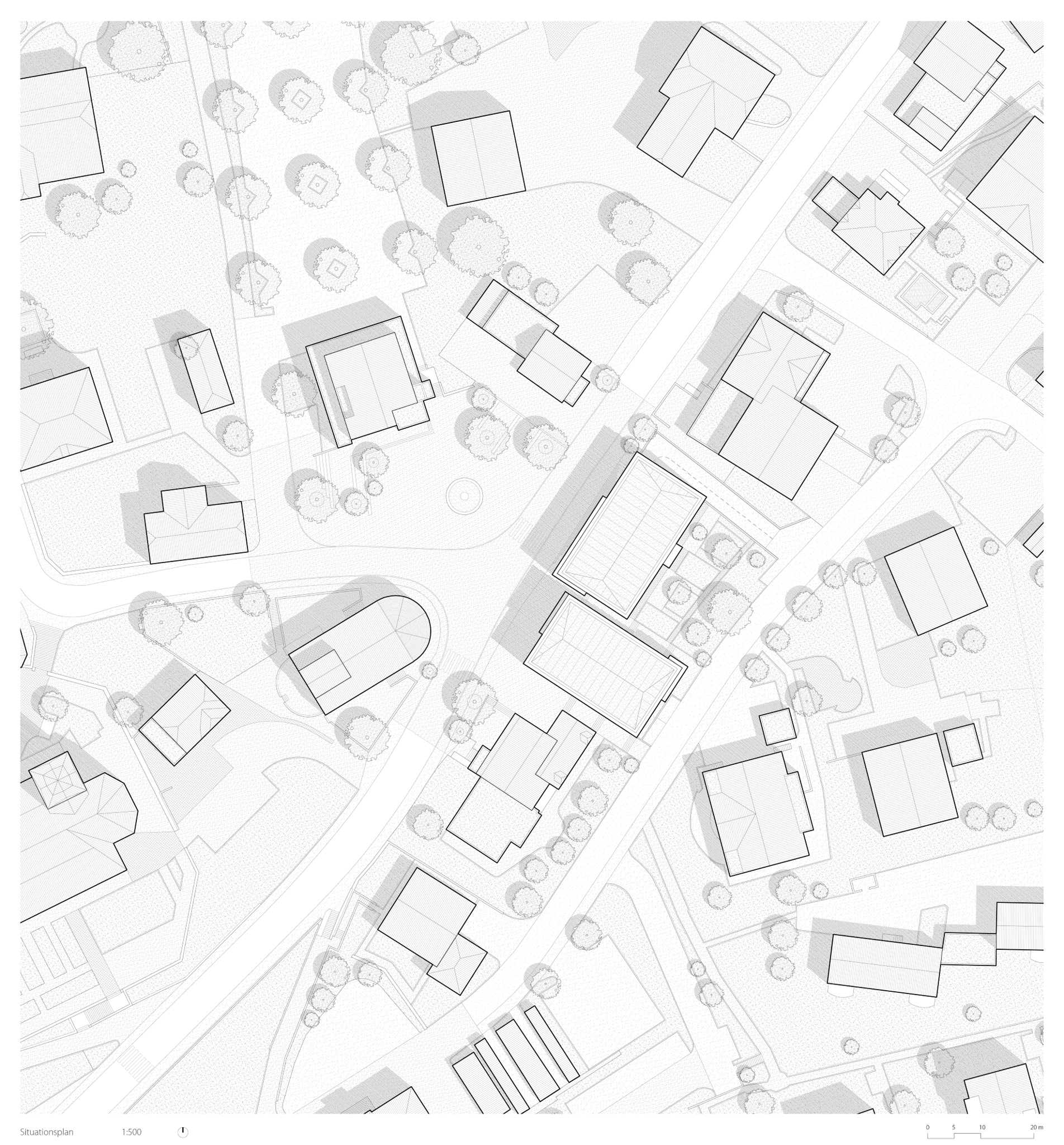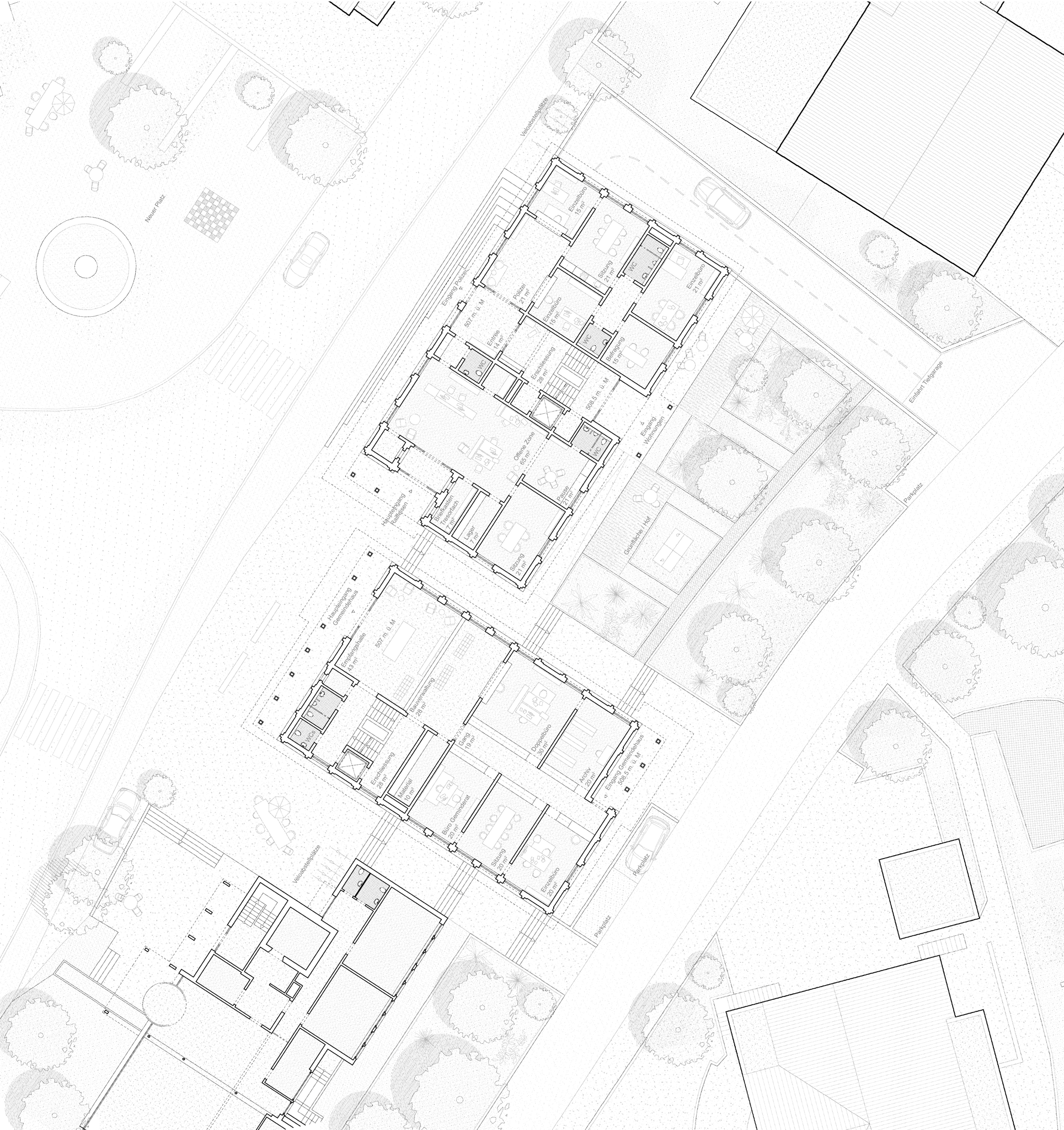 Der Neubau wird in zwei Volumen organisiert, die durch die unterirdische Tiefgarage miteinander verbunden sind. Das Gebäude wird durch seine Funktion und sein Raumprogramm klar gegliedert.